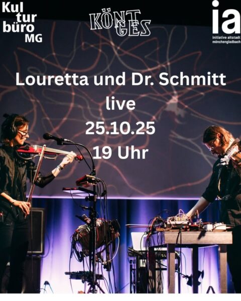 Louretta (E-Geige, Modular-Synthesizer) und Dr. Schmitt (E-Gitarre, Modular-Synthesizer) beschäftigen sich mit generativen Systemen. Einzelne Töne können komplexe Prozesse in Gang setzen, die sich gegenseitig beeinflussen. Alltagsgeräusche und Instrumente verweben sich zu eindrucksvollen Klanglandschaften. Ein Konzert zum Lauschen und Träumen.